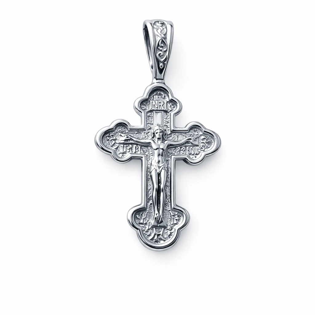 Das orthodoxe Kreuz IKs255125179 besteht aus hochwertigem rhodiniertem 925er Sterlingsilber und überzeugt durch sein beidseitiges Design, das dem Schmuckstück besondere Tiefe und spirituelle Bedeutung verleiht.