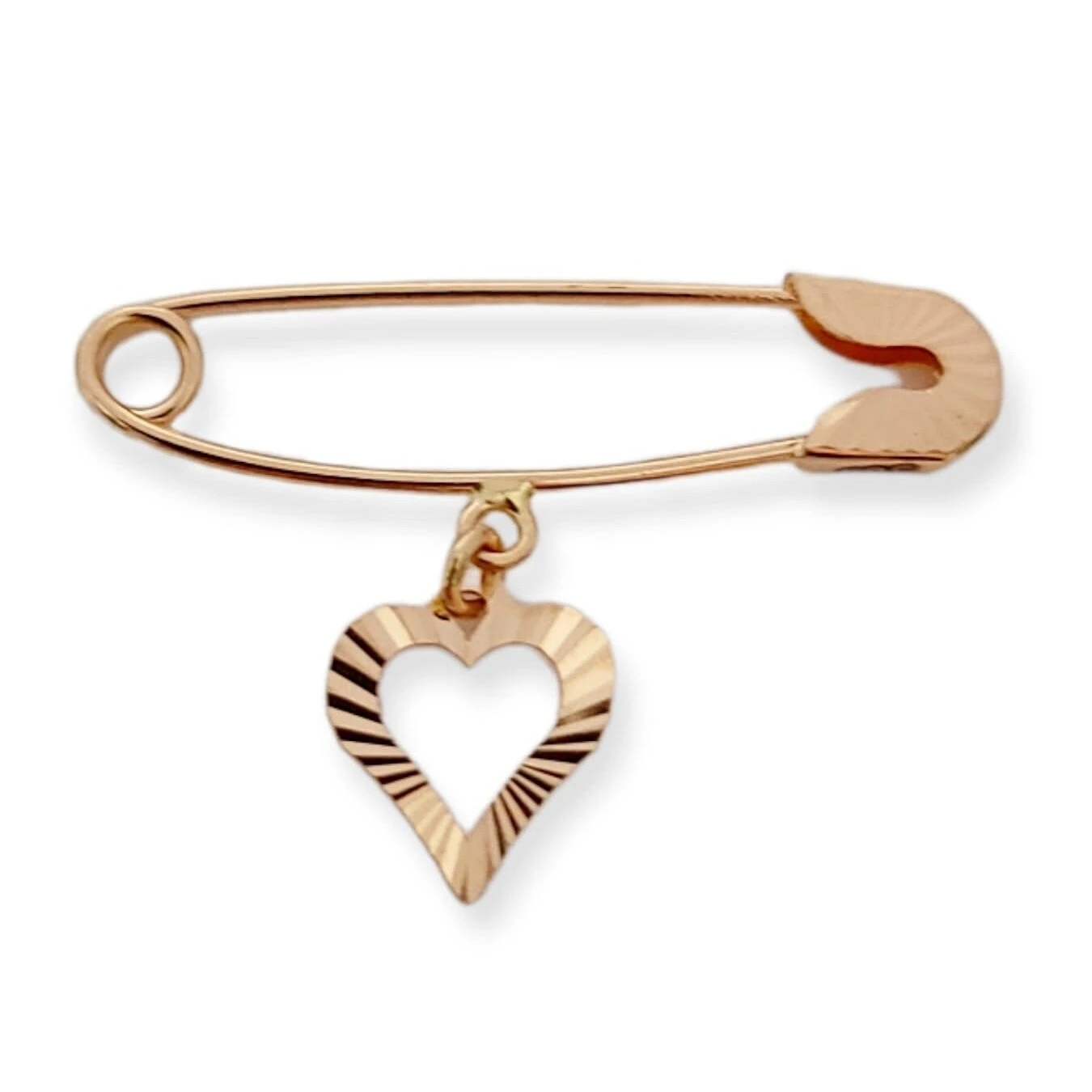 Brosche (Pin) aus 585er Rotgold, verarbeitet mit der Technologie von "Diamantiert". Ein Schmuck mit einem schönen Design und Herz Einhänger.