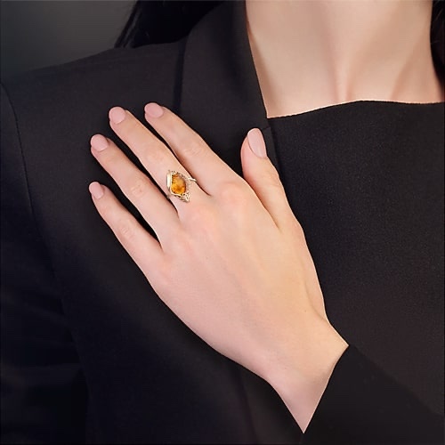 Entdecken Sie die zeitlose Eleganz dieses exquisiten Damenrings aus edlem russischen 585er Rotgold, kunstvoll verziert mit Bernstein. Dieses Schmuckstück verkörpert die harmonische Vereinigung zwischen der warmen Ausstrahlung des Rotgolds und der natürlichen Anmut des Bernsteins. Jedes Detail wurde sorgfältig gestaltet, um einen einzigartigen und unverwechselbaren Ring zu schaffen. Tragen Sie dieses Meisterwerk und lassen Sie sich von seiner Schönheit verzaubern. Ein Juwel, das Sie in jedem Moment Ihrer Geschichte begleiten wird.