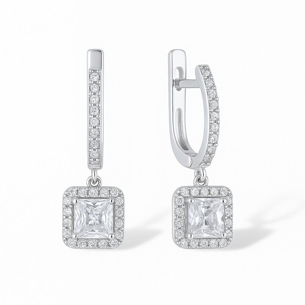 Paar Ohrhänger aus 925er Silber, die zuvor mit der "Rhodium" - Technologie verarbeitet wurden. Das Schmuckstück bezaubert mit Zirkonia. Verschlussart: mit englischer Verschluss.
