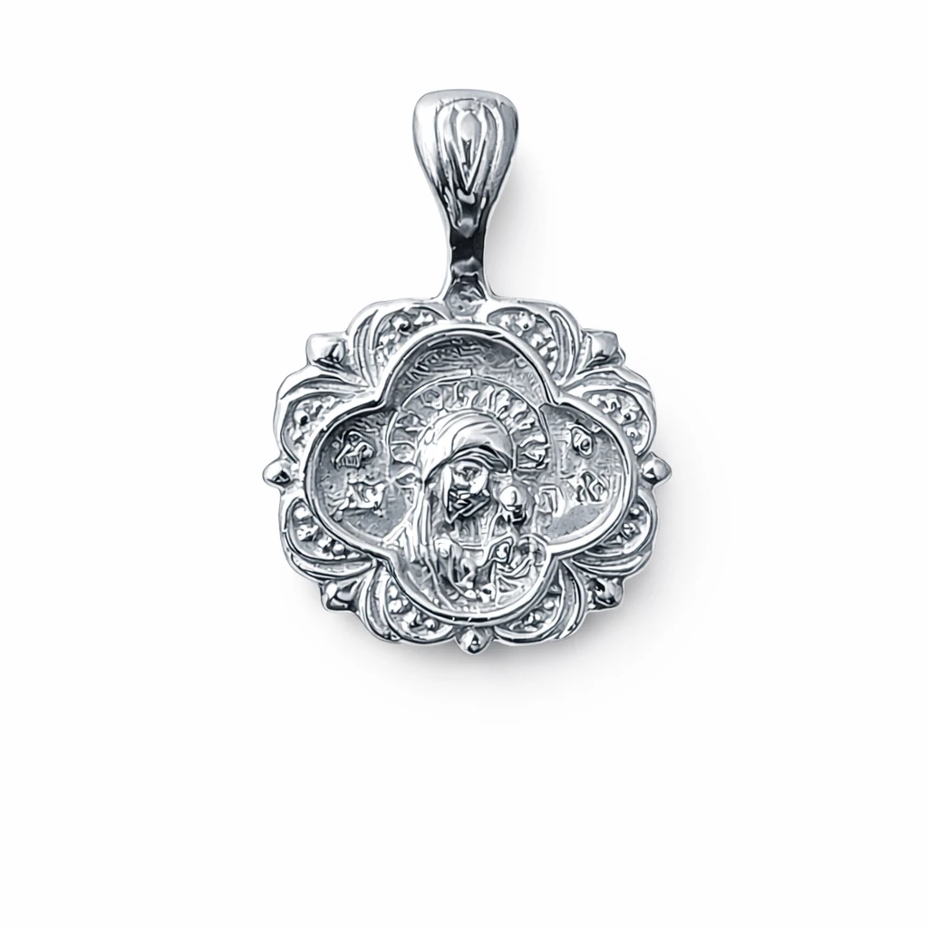 Иконка-подвеска IKs195125145 выполнена из серебра 925 пробы и украшена образом Богородицы с младенцем. На обратной стороне размещена молитва, придающая изделию глубокий духовный смысл.