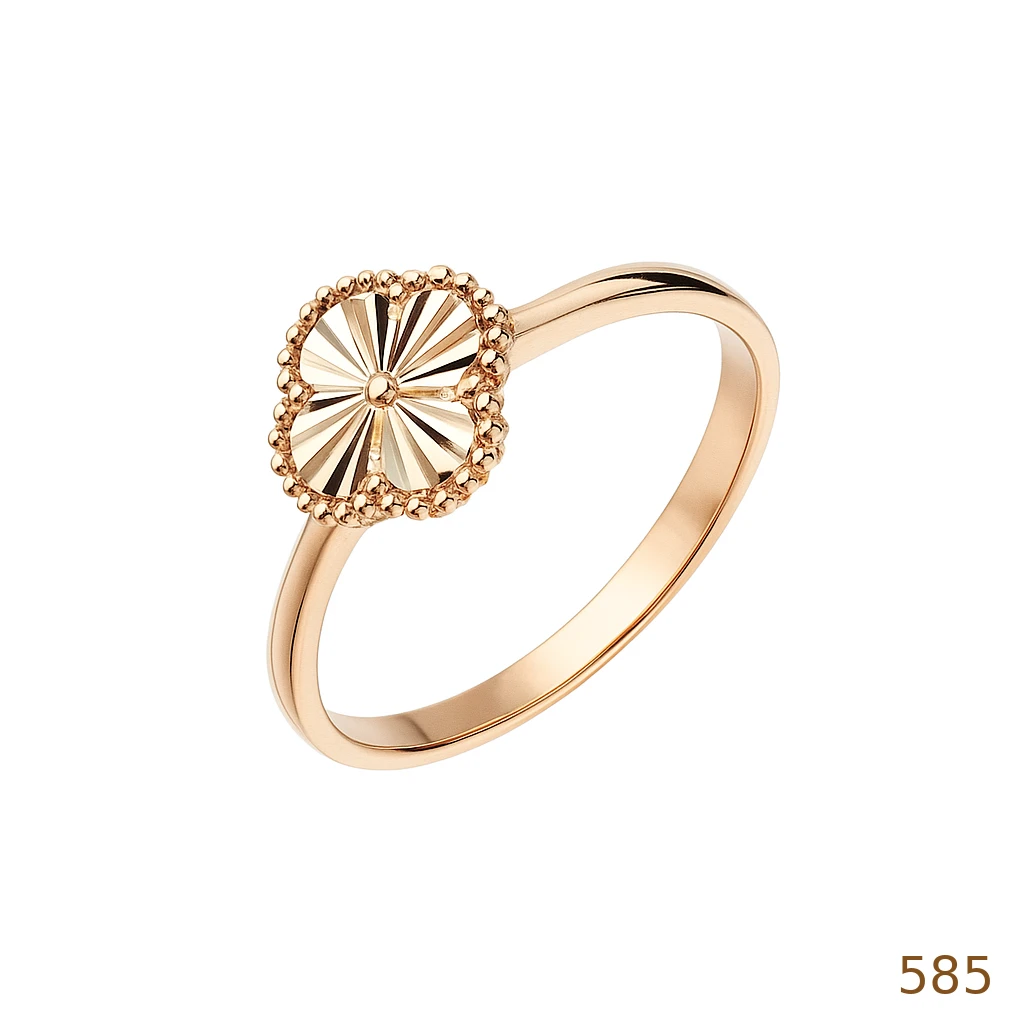 Кольцо "Клевер" из красного золота 585 пробы с алмазной гранью – это элегантное украшение, которое станет символом изящного стиля и изысканности. Этот роскошный аксессуар, выполненный с филигранной точностью, отличается своей уникальной алмазной огранкой, которая придает кольцу необыкновенное свечение и блеск. Сочетание благородного красного золота и великолепной гранёной поверхности создаёт завораживающий эффект, подчёркивающий красоту и утончённость изделия.