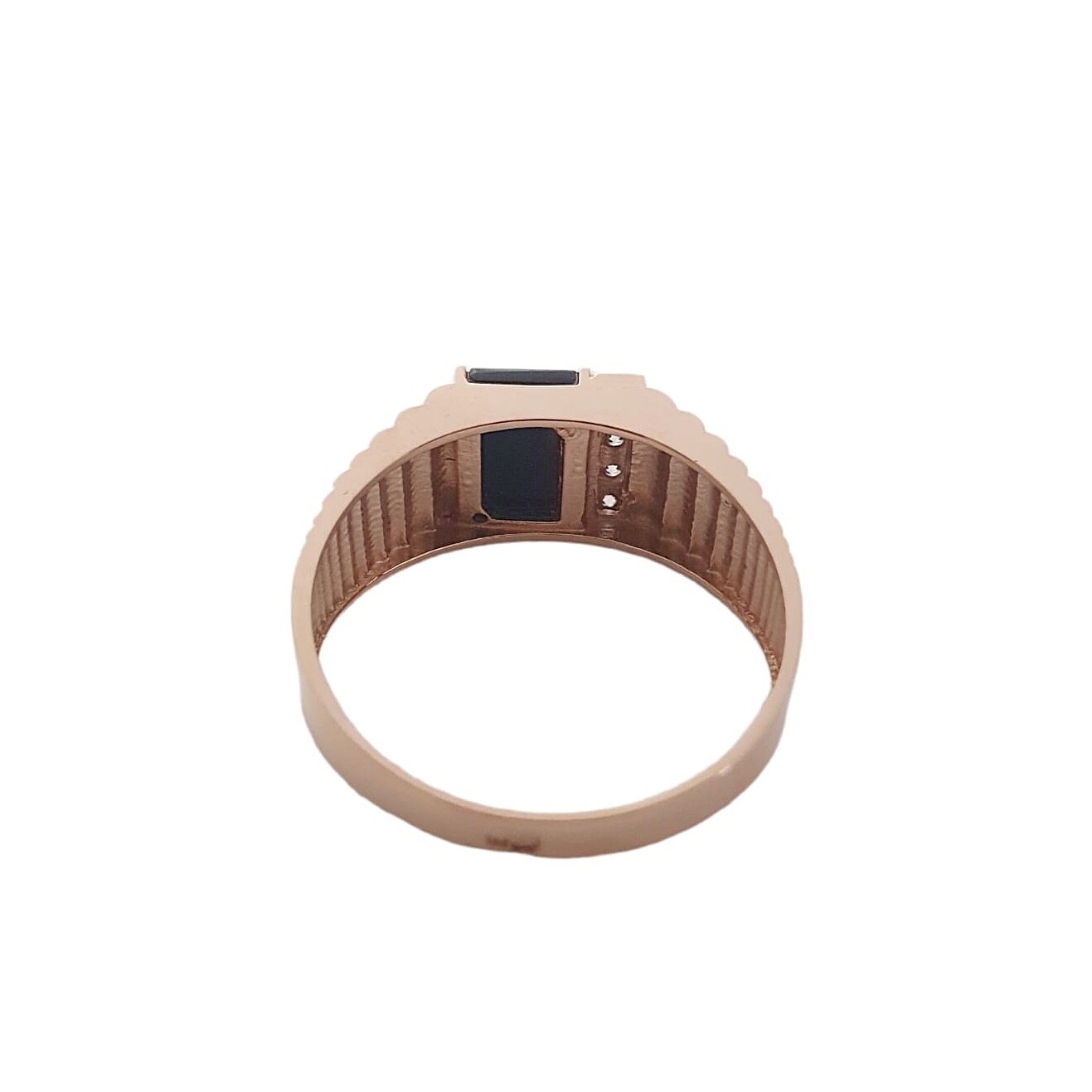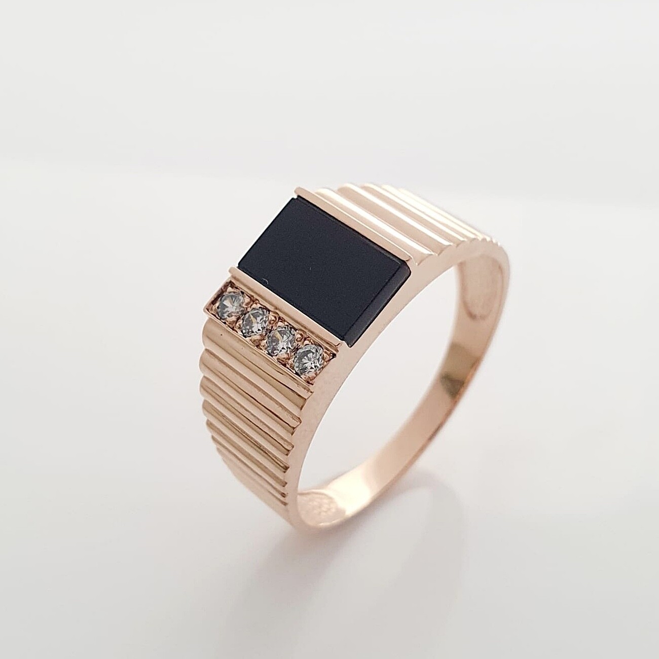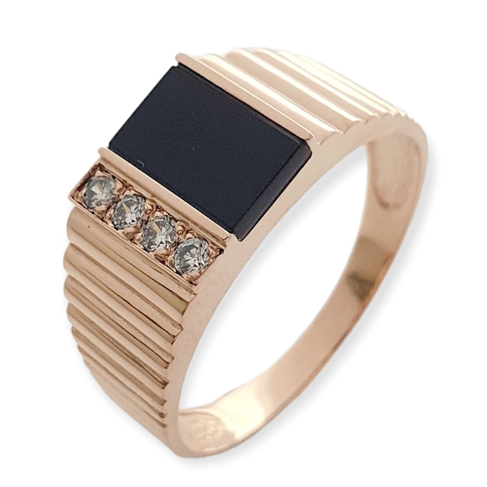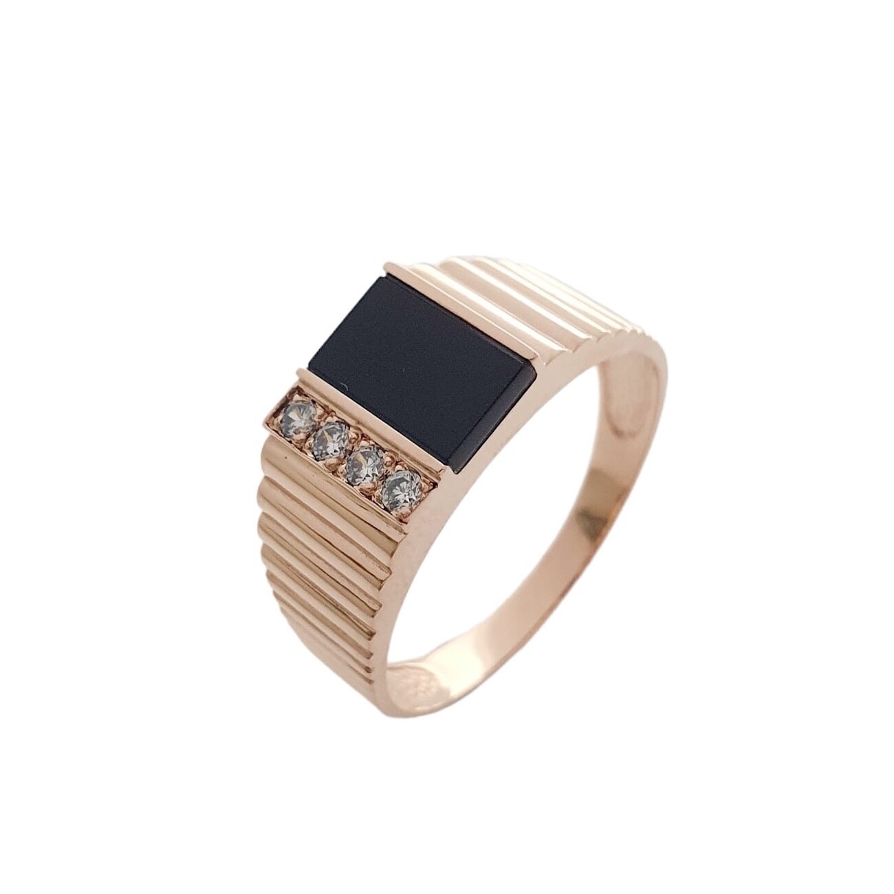Мужское кольцо из красного золота 585 пробы, с белыми и черным фианитами.
