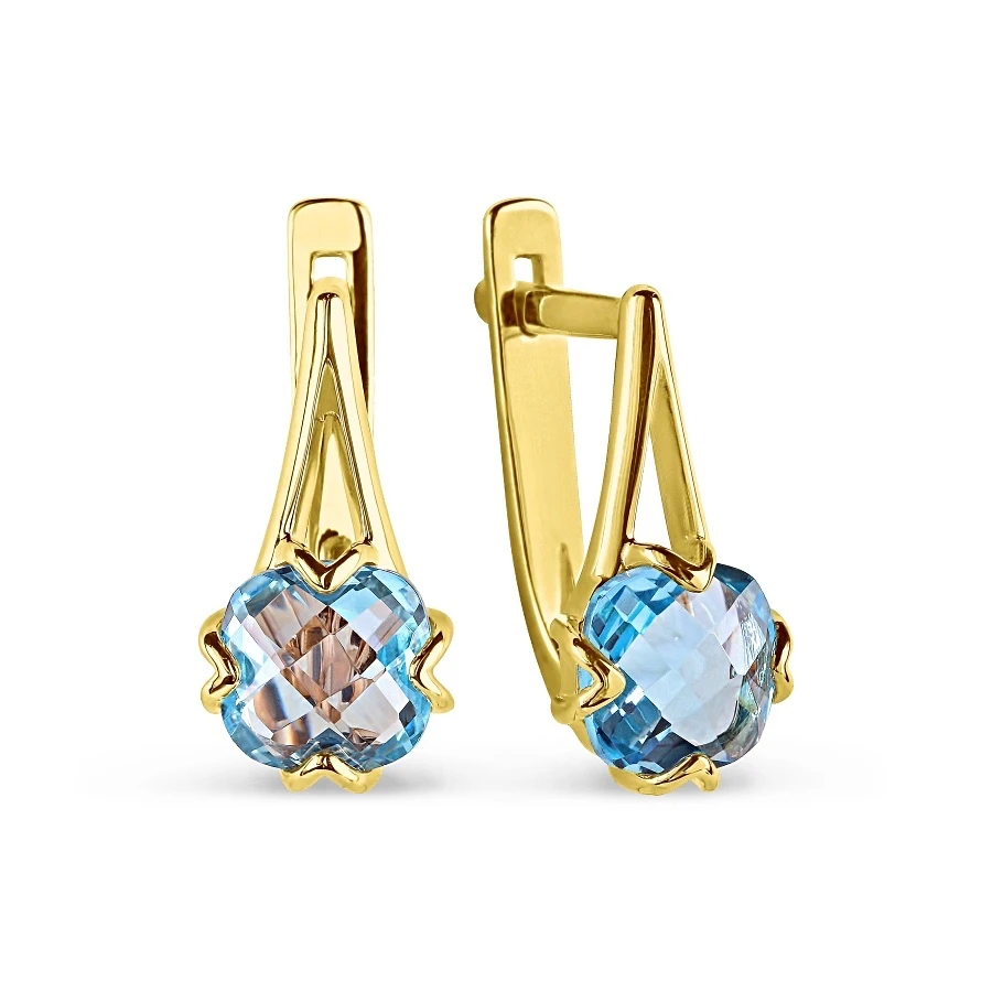 Серьги из жёлтого золота 585 пробы, обработанные по технологии "Родирование". Украшены натуральными голубыми топазами.