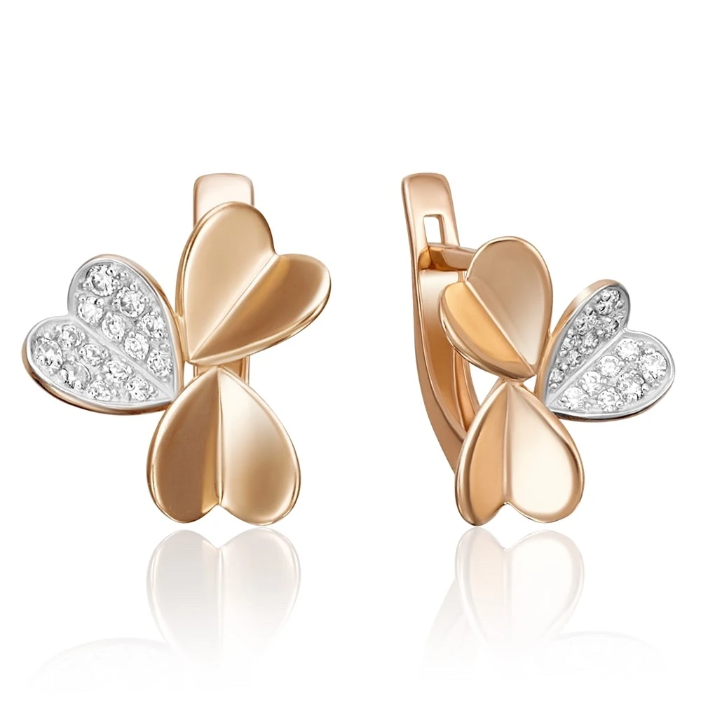 Серебристо-розовые серьги с белыми фианитами из красного русского золота 585 пробы