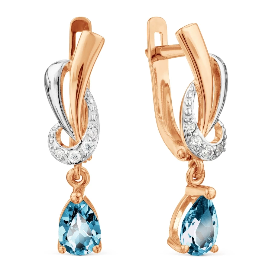 Эти изысканные серьги изготовлены из красного золота 585 пробы и украшены прекрасными Лондон топазами в форме капли и блестящими фианитами. Их элегантный дизайн и изысканный вид делают их идеальным аксессуаром для особых моментов или повседневного использования. Каждая деталь этих серег тщательно проработана, чтобы создать утонченный и элегантный образ. Эти серьги станут прекрасным дополнением к вашему уникальному стилю и привнесут неповторимое очарование в ваш образ.