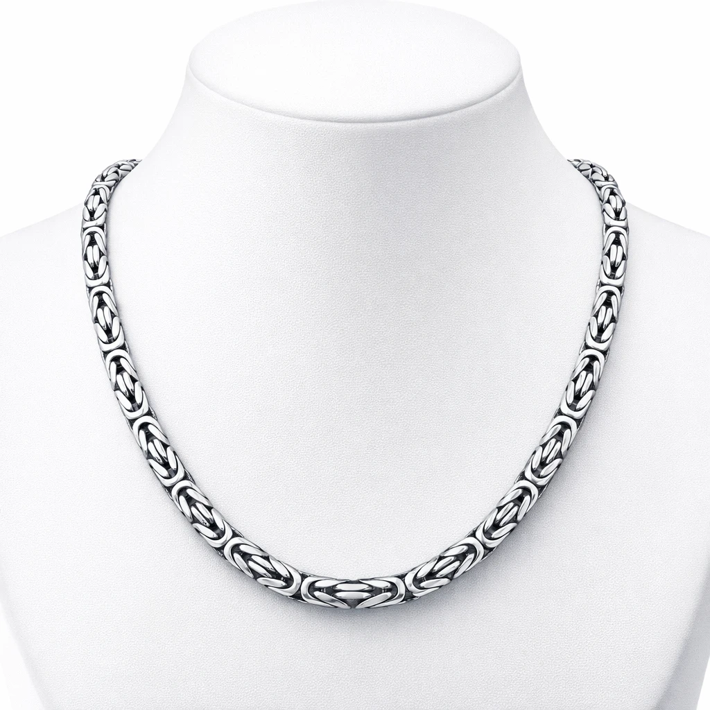Королевское плетение известно своей прочностью, плотностью и эффектной геометрией звеньев. Такая цепочка идеально подходит как для самостоятельного ношения, так и в сочетании с крупными подвесками.