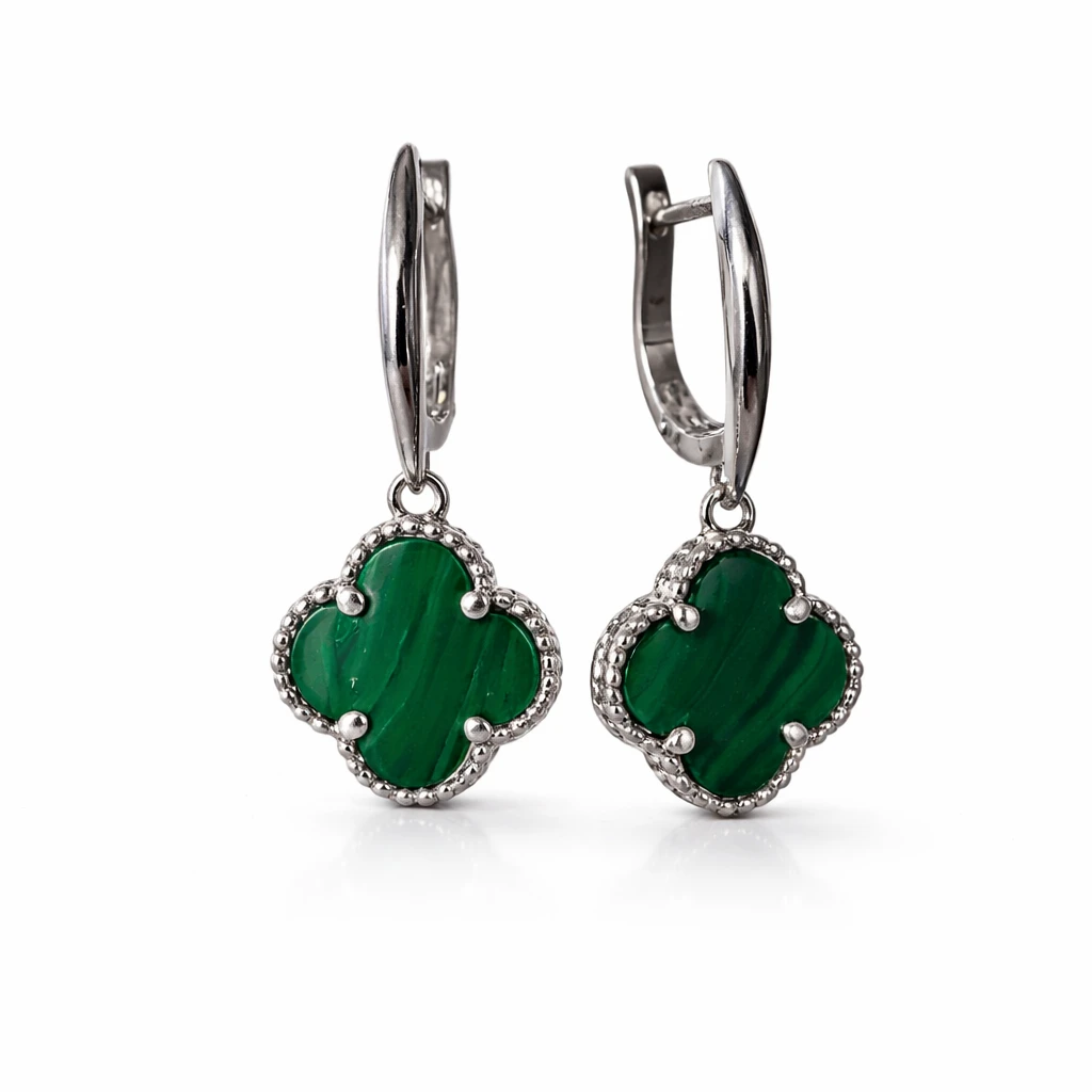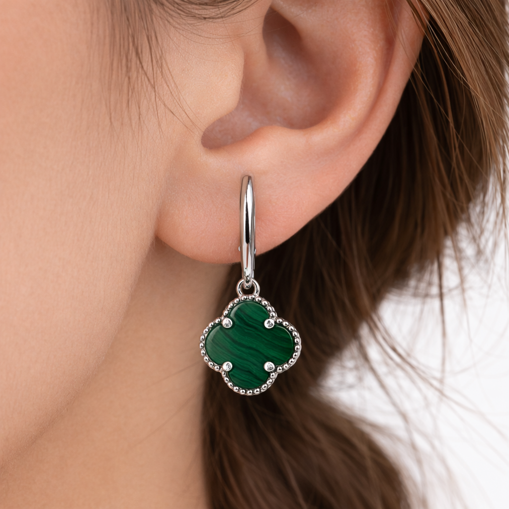 Форма клевера издавна считается символом удачи, гармонии и благополучия, благодаря чему серьги несут не только эстетическую, но и символическую ценность. Висячий формат визуально вытягивает линию шеи, добавляя образу женственности и лёгкости.